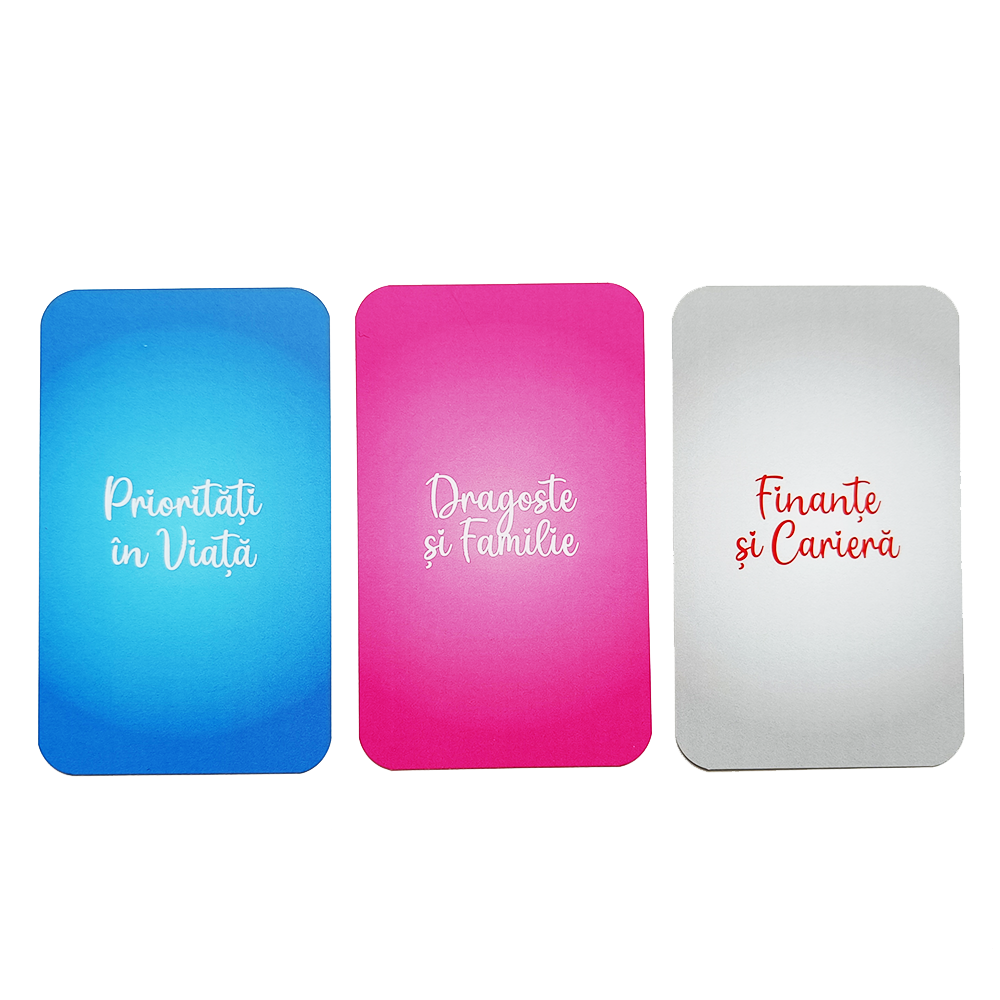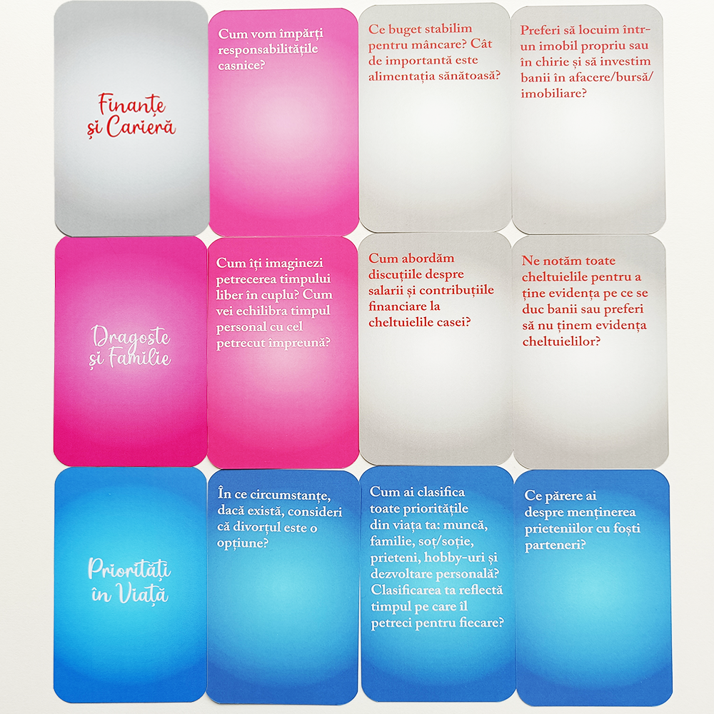 Cu intrebari care provoaca gandirea in trei arii-cheie: Finante si Cariera, Dragoste si Familie, Prioritati de Viata, acest joc asigura ca tu si partenerul tau sunteti aliniati in privinta aspectelor esentiale ale vietii de cuplu inainte de a face urmatorul pas important.
