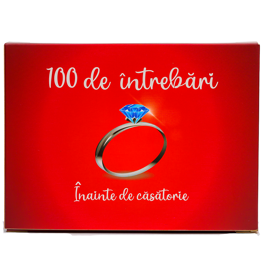100 de intrebari. Inainte de casatorie: Stiai ca aproape 20% dintre cupluri divorteaza in primii 3-5 ani de casatorie? De multe ori, acest lucru se intampla pentru ca chimia initiala a iubirii poate umbri provocarile reale ce apar intr-o relatie. Acest joc psihologic este creat pentru a ajuta cuplurile sa aiba conversatii utile despre viitorul casniciei lor.