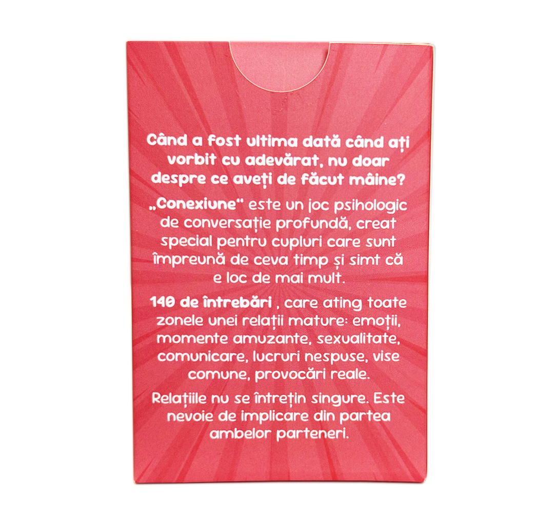 „Conexiune” este un joc psihologic de conversație profundă, creat special pentru cupluri care sunt împreună de ceva timp și simt că e loc de mai mult.